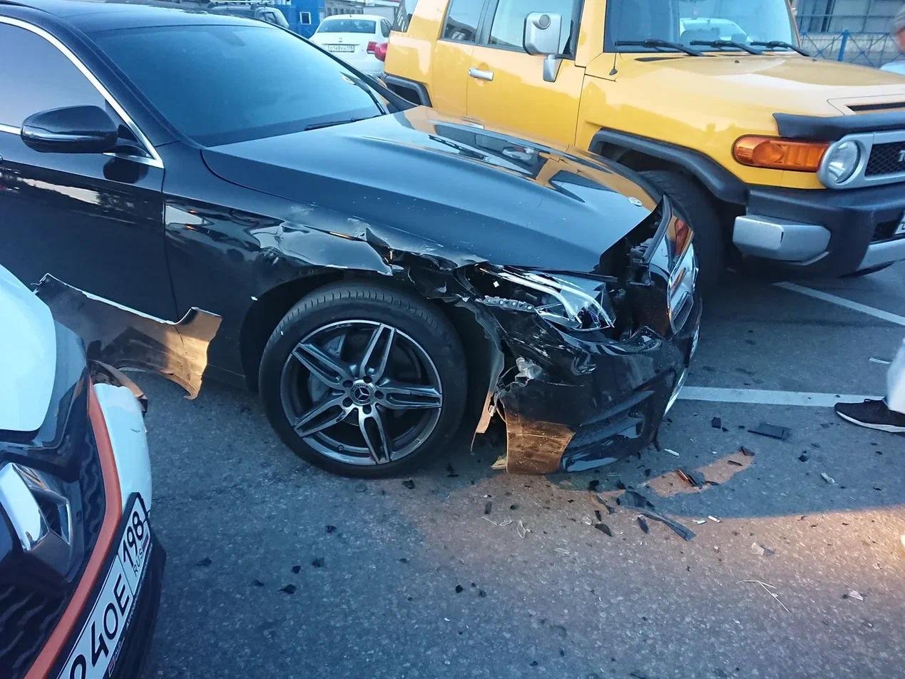 У моей Тойоты: разбита вся оптика сзади и спереди, смяты все крылья, бампера, капот, багажник, крыша. Капот открылся и разбил лобовое. У внедорожника и мерса чуть-чуть покосились бампера.