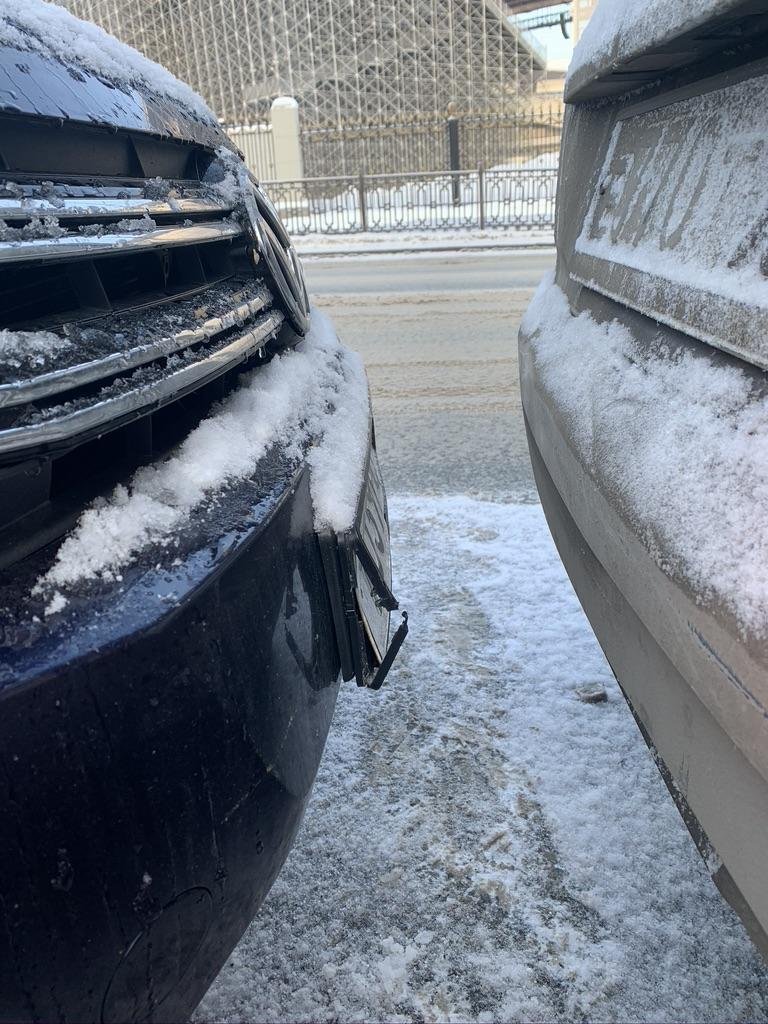 Так как у нас любят строить человейники без организации нормальных парковочных мест, то двор текущей дислокации был заставлен кучей других пепелацев, и, по итогу моих маневров с разворотами по темноте, я на 5 км/ч влетел в старенькую toyota carina, если бы дело происходило летом, то наверное отделался бы легким испугом, но на 30 градусном морозе бампер пыжика не вынес удара и треснул.
