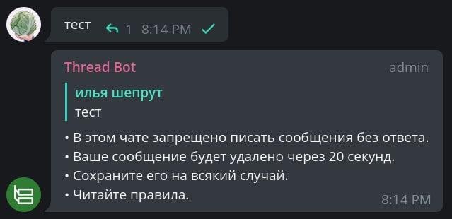 Данный бот просто запрещает писать сообщения без ответа. В итоге даже если в чат вступят люди, то им придётся так писать чтобы их всегда было видно в комментариях.