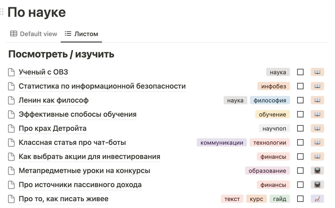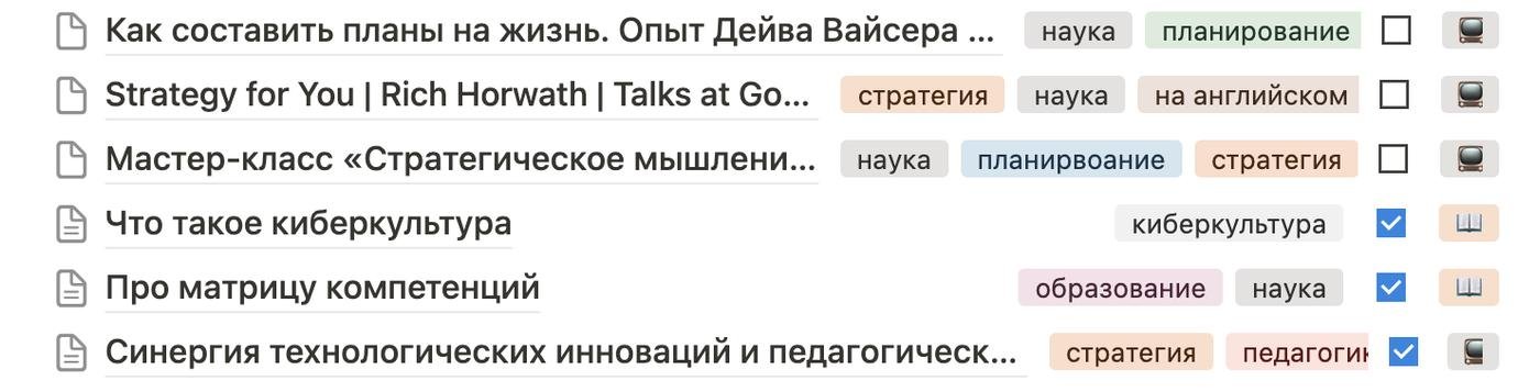 Пример со списком для чтения и просмотра. Галочкой отмечены те, которые изучил: