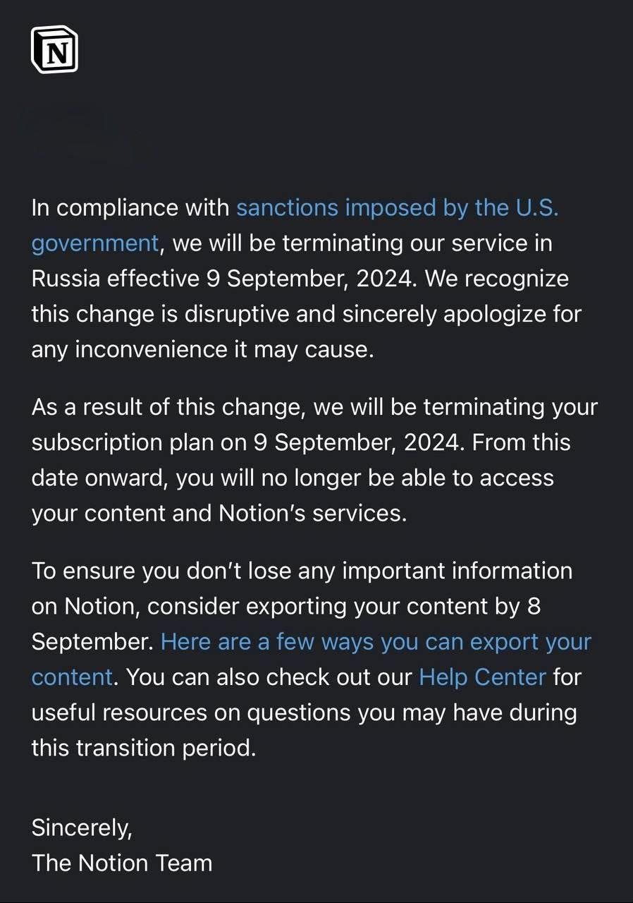 Из-за санкций США с 9 сентября Notion закрывает доступ для россиян на платформе (сурс).