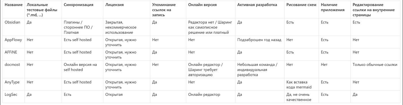 Obsidian - использую реже, собираю там рабочую базу данных с примерами работ, заданий и картинками. Селфхост. Жаль нет мобильной синхронизации (да, пользуюсь бесплатной версией) и приложения на телефон.