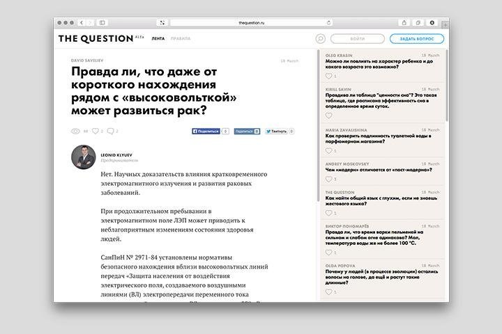 Сервис вопросов и ответов The Question от журналистки Тони Самсоновой. The Question позиционировал себя как сообщество, где любой мог спросить что угодно - от бытовых мелочей до сложных научных тем, - а ответы давали либо эксперты, либо обычные пользователи с опытом. Сайт быстро набрал популярность благодаря качеству контента: а лучшие ответы продвигались редакцией. К концу первого года у сервиса было около 80 тысяч экспертов а аудитория росла в геометрической прогрессии. К 2019 году The Question достиг 10 миллионов пользователей в месяц и собрал базу из 700 тысяч вопросов и ответов. Деньги проект зарабатывал на рекламе и партнерских корпоративных аккаунтах, где компании отвечали на вопросы аудитории. Самсонова говорила, что сервис вышел на операционную рентабельность еще до продажи.
