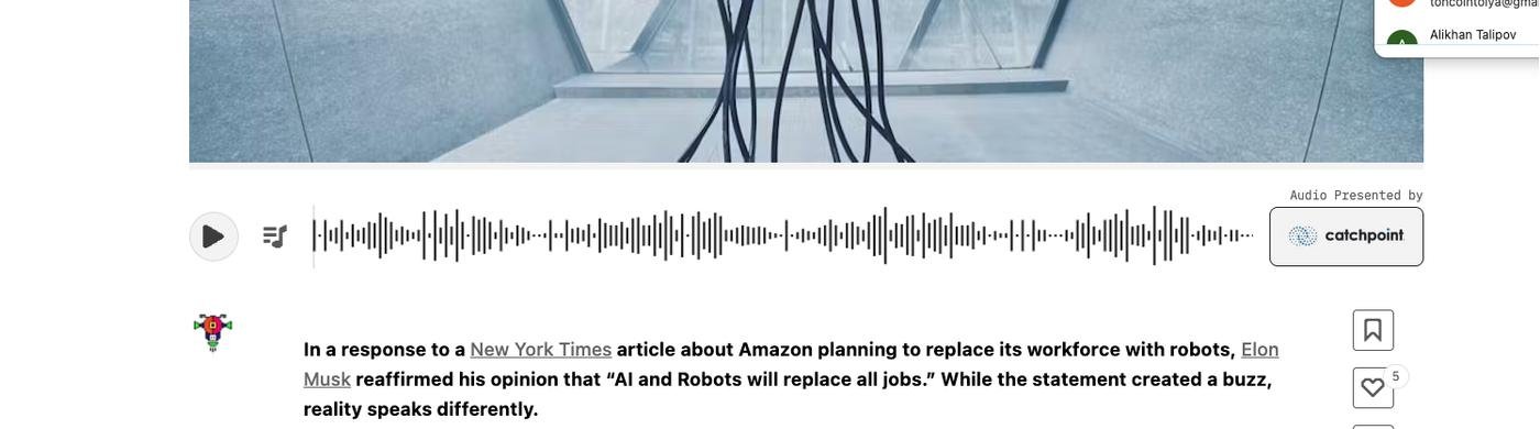 Было бы круто иметь какой-нибудь плеер на статьях, чтобы их можно было слушать, а не читать. Вот пример из статейки Hackernoon: https://hackernoon.com/ai-is-a-tool-for-economic-progress-not-a-job-taker