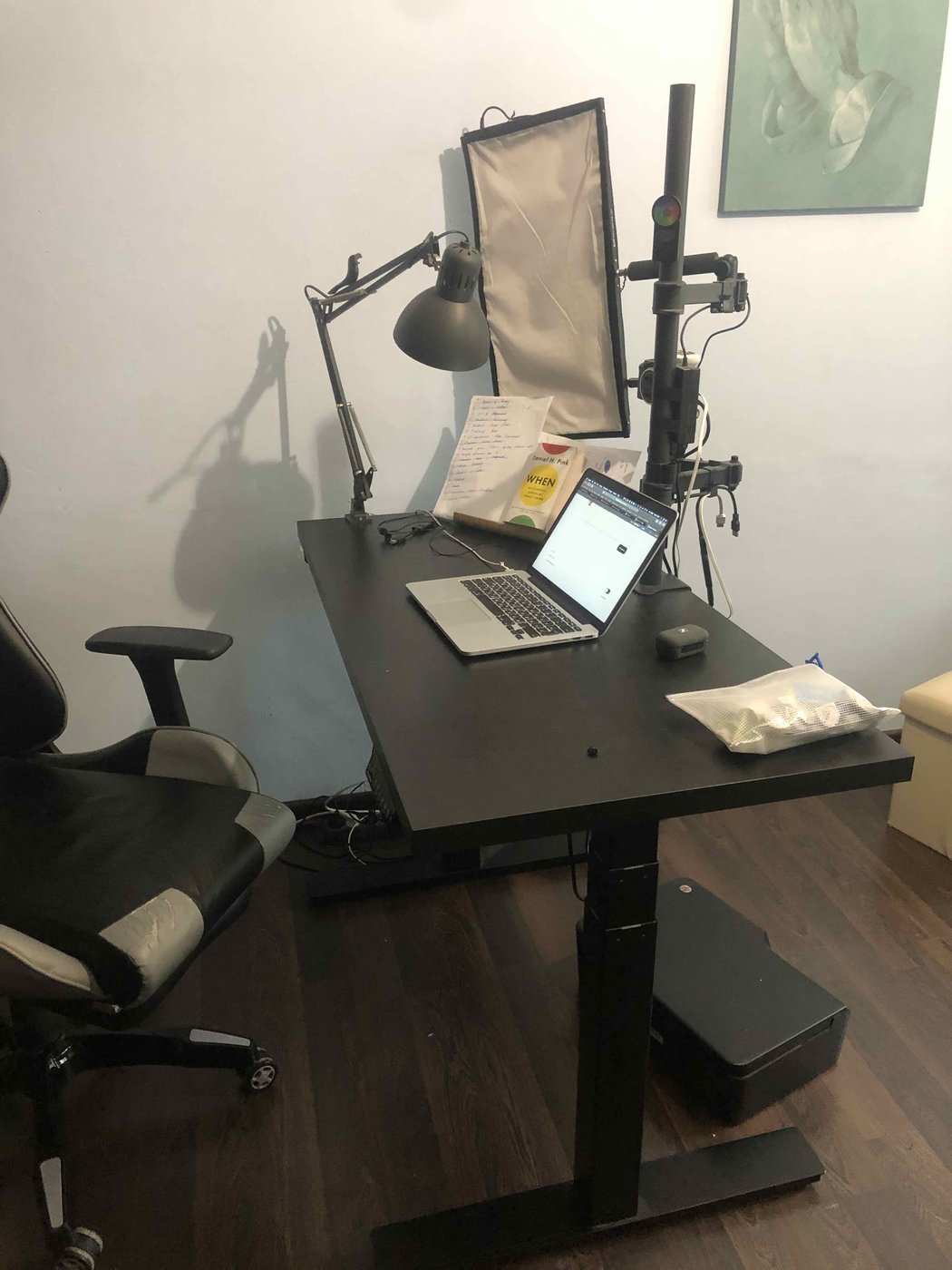Мы с женой вложились в регулируемый по вертикали стол с доп. опциями. Тяжёлые регулируемые по высоте ноги из стали, тяжёлая и мощная столешница из композита (дерево + ещё что-то), закруглённые мягкие края. Вся конструкция держит 120кг веса. Плюс прикручиваемый держатель с двумя телескопическими руками под монитор и ноут. Всё вместе примерно 700 USD.