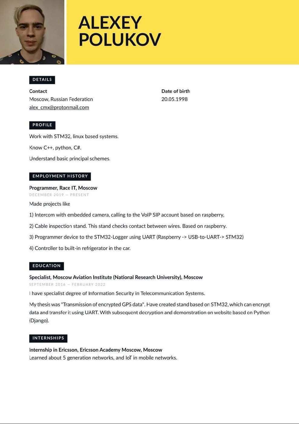 Навыки: docker, git, linux, windows, hyper-v, powershell, bash, python, c, embedded, mssql, ccnp