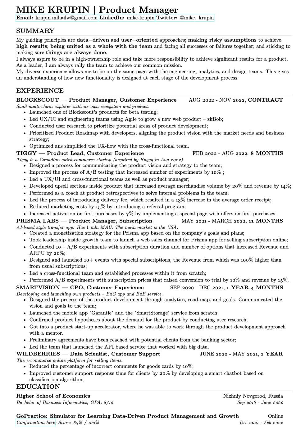 Есть хороший опыт в роли разработчика/аналитика, поэтому обычно понимаю, что делают техническая команда в продукте. Есть хороший опыт в продакт менеджменте, а именно в сферах: photo editing (международная компания Prisma Labs), q-commerce (канадский стартап Tiggy), Web3 (эксплорер со своей экосистемой Blockscout). Также запускал свой собственные B2C и B2B продуты.