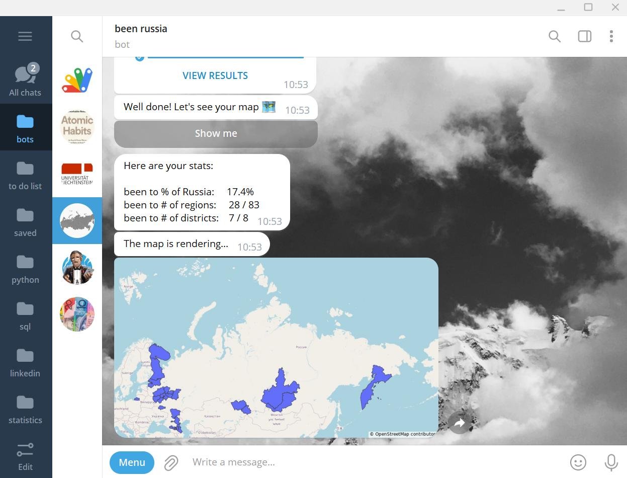 ⭐️ Проект: been russia - тг-бот, который присылает карту с регионами россии, где побывали:)