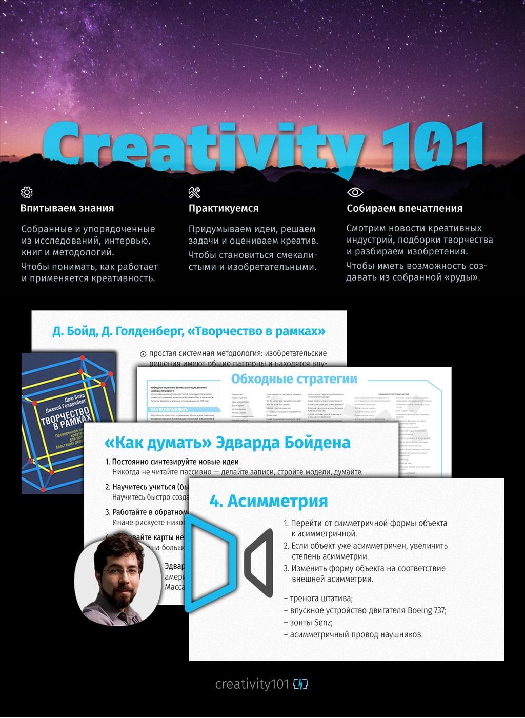 – популяризируем креативное мышление и делаем его доступнее для понимания и использования;