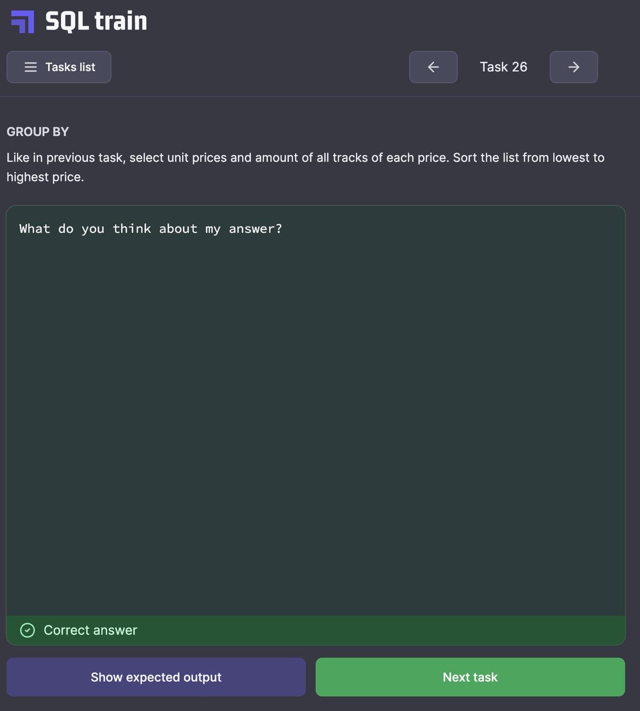 Самое классное, что в отличие от аналогов этот тренажер работает исключительно в браузере, но при этом честно запускает SQL-запросы в настоящей базе данных.