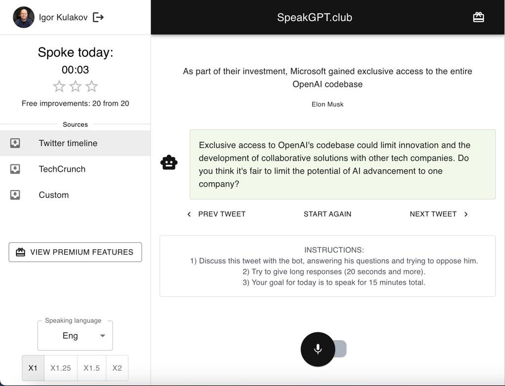 Сервис для практики разговорной речи на иностранном языке на высоких уровнях B1-C1.