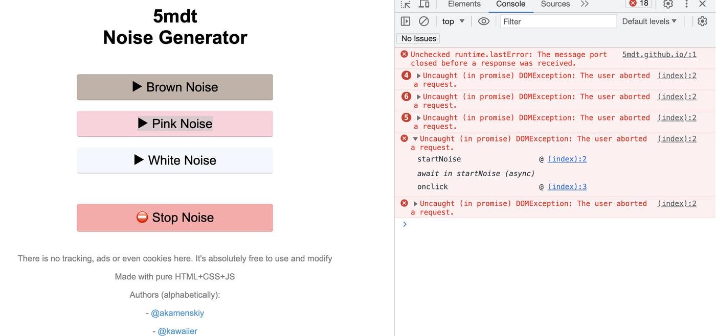 Это простая HTML страница с JavaScript, на которой всё что есть - это кнопки запуска разных типов шумов и его выключения.