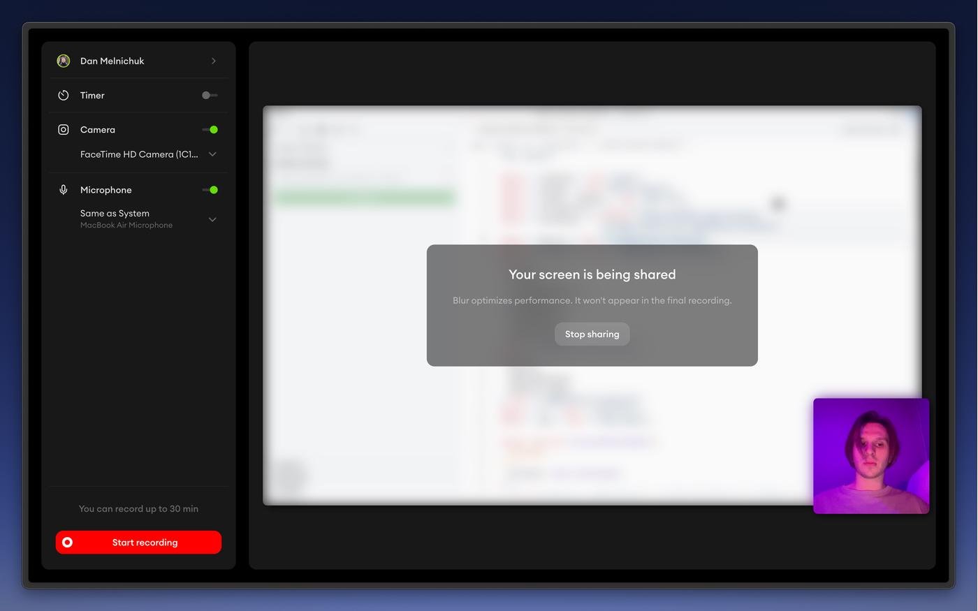 Лучший продукт для этого — Cleanshot X, но он платный, только на мак и требует установки в систему. Loom скурвился, стал нагруженным и продался Atlassian, а все остальное нам просто не нравилось. Поэтому мы сделали свою версию, которая просто работает по ссылке и дает классный результат. Без регистрации и смс.