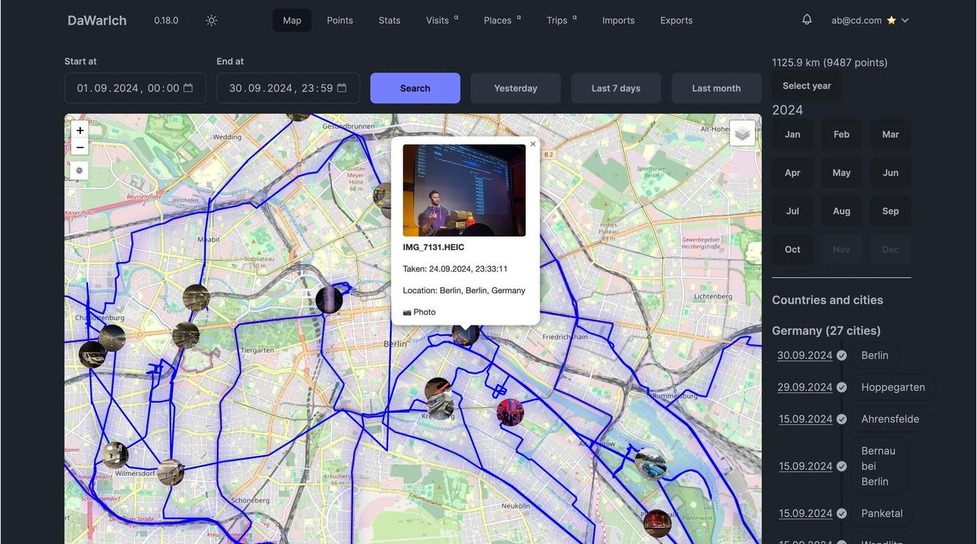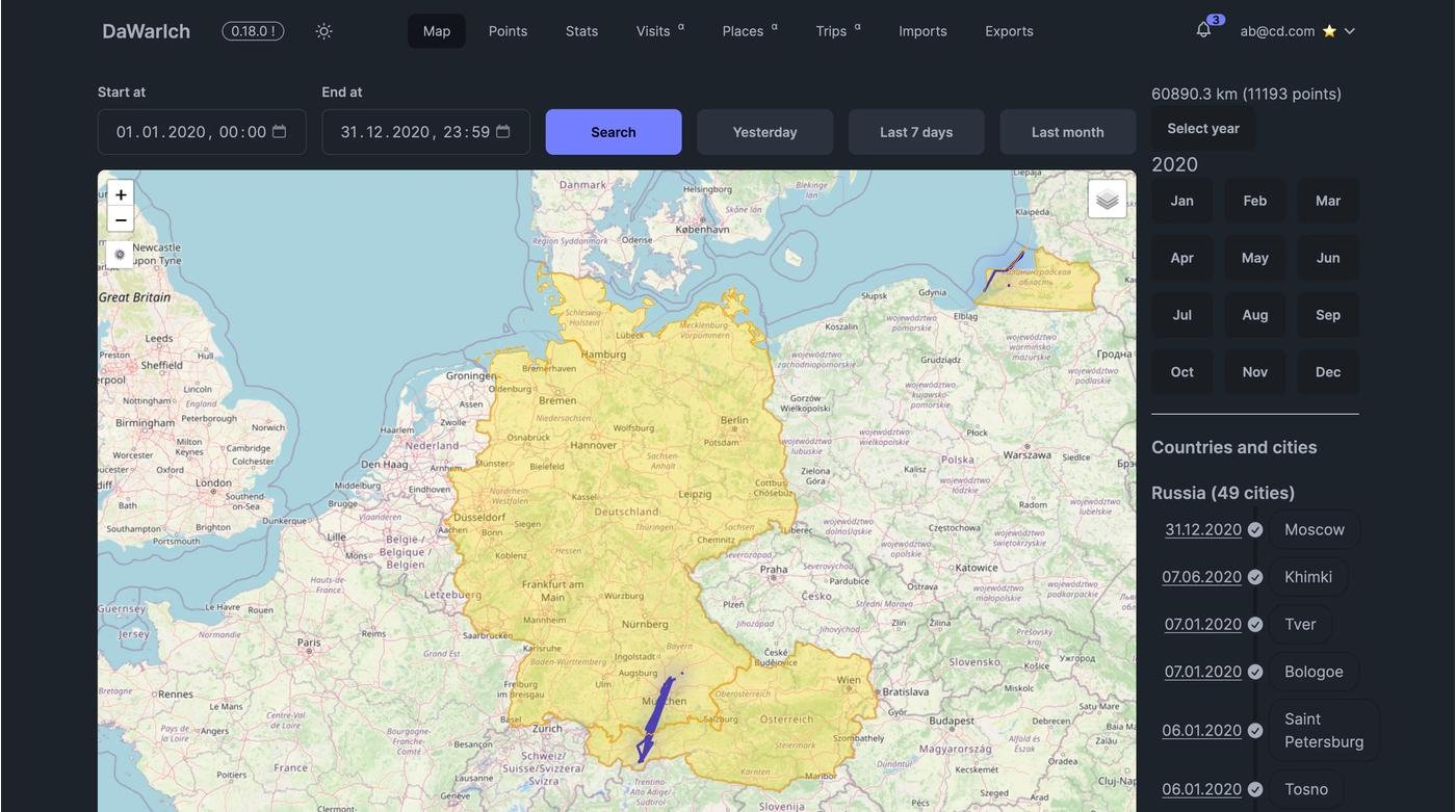 Теперь можно создавать путешествия, а когда провайдишь даты начала и конца, Даварих сам подтянет тебе все точки, нарисует твой маршрут и посчитает расстояния. Если есть интеграция с Иммихом, фотки подтянет тоже.