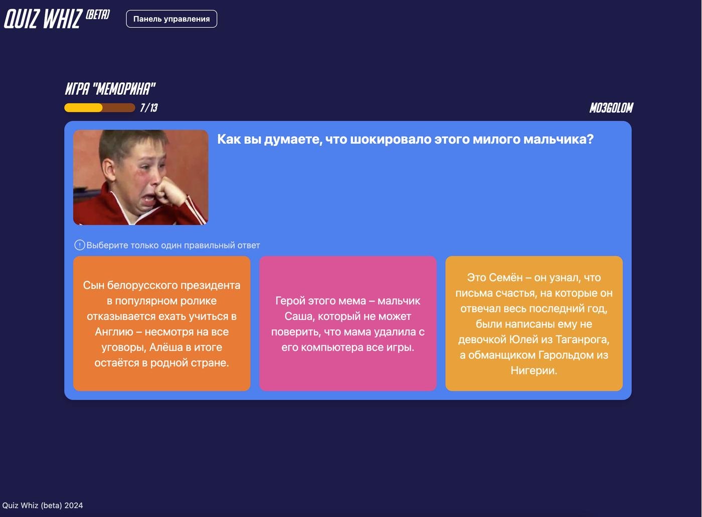 Платформа для создания и проведения викторин, которая позволяет удобно создавать викторины и гибко настраивать их под свои нужды (например, отображать ли ввод имени перед началом игры, показывать ли правильный ответ в случае выбора неправильного, и т.д.).