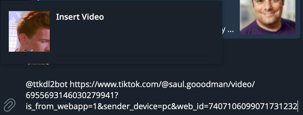 @ttkdl2botи после пробела ссылку на видео. Через пару секунд появится кнопка Insert Video, на которую и нужно нажать, чтобы произошла магия.Как это работает: простенький скрипт на питоне (да здравствует гпт!) делает запрос к https://www.tikwm.com/en/ и отвечает в телегу видосом.