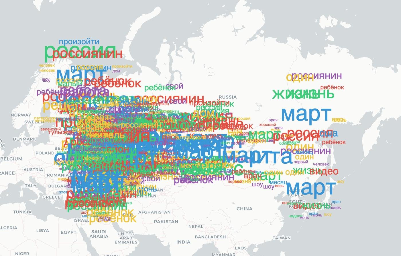 Я люблю что-нибудь парсить. У меня в голове давно была мысль регулярно собирать все новости России, чтобы можно было посмотреть их дистрибуцию. Просто потому что интересно. В итоге получились самые частотные слова в новостях по разным регионам. Такая средняя температура по больнице. Если приблизить, то можно даже что-то прочитать.