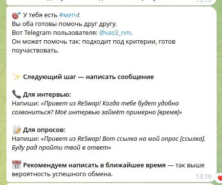 Бот ReSwap помогает людям взаимного обогащать нетворк друг друга и кабанчиком “решать вопросики” по пути