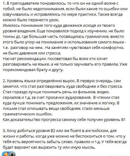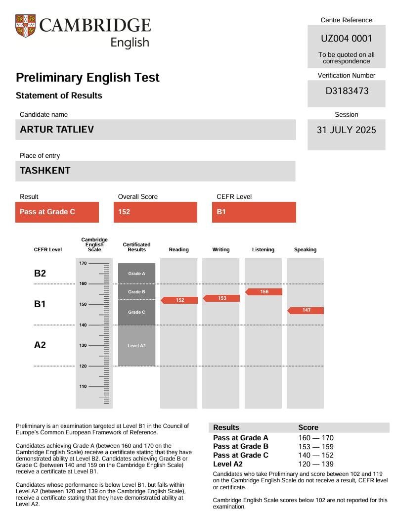 Спустя 7 месяцев смогли сдать экзамен на B1 от Cambridge. Теперь идем к B2. Сертификат и отзыв на фото.