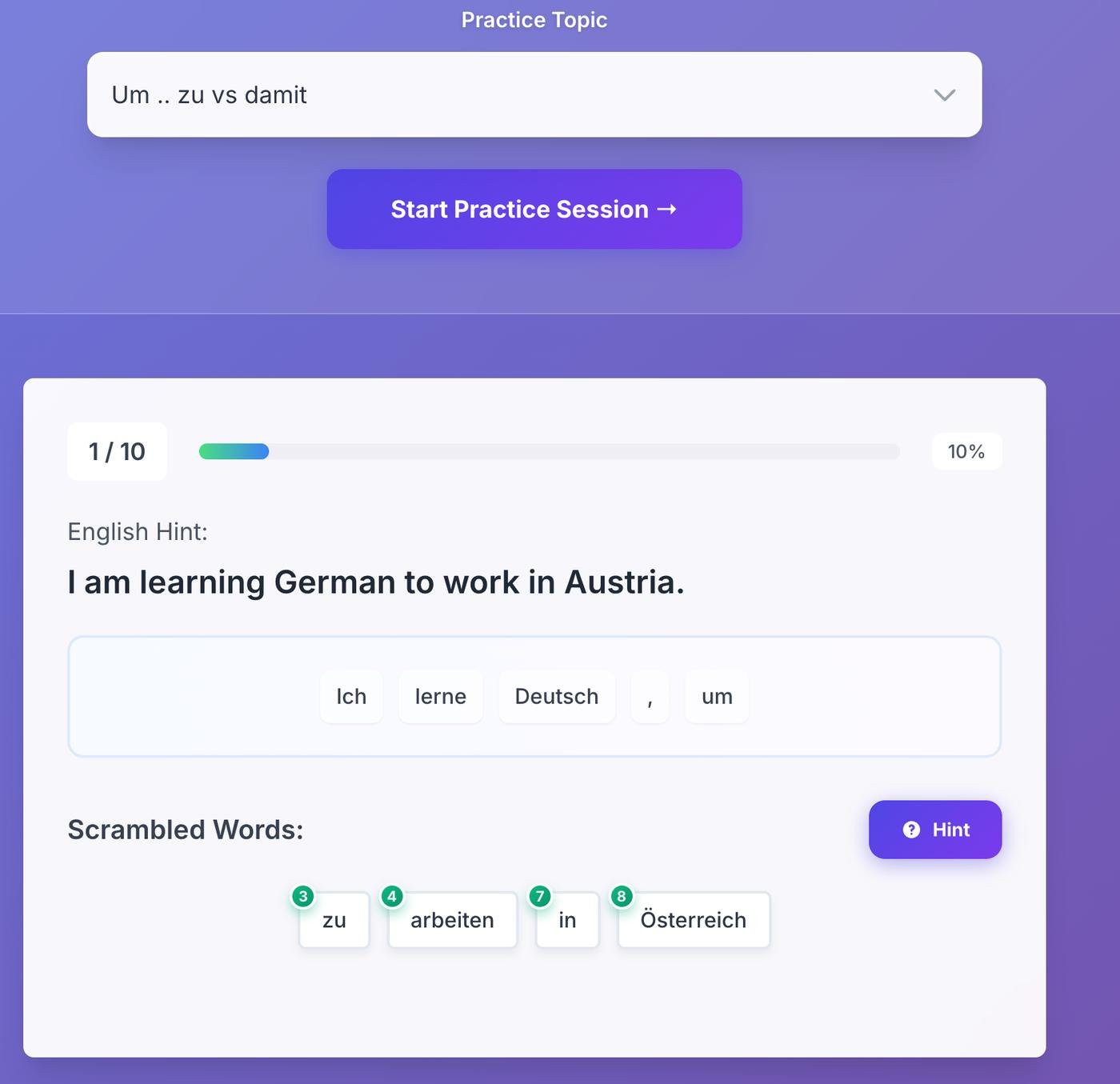 Создаешь ему тему (только для зарегистророванных юзеров) в которой описываешь что тренировать, и он через llm начинает создавать упражнения в эту тему. Плюс можно описать на чём фокус и какие слова тренировать. LLM прекрасно справляется, не зря же оно языковая модель.
