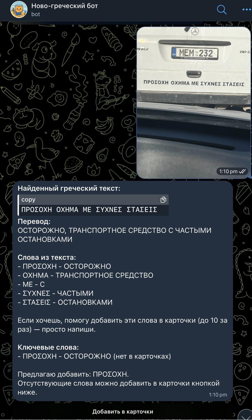 Можно даже скинуть фотку с греческим текстом и получить перевод + добавить самые важные слова к себе в карточки.