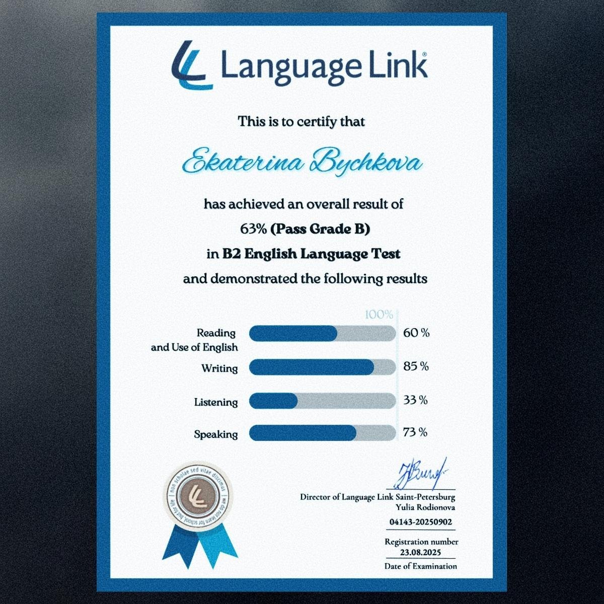 В итоге мы смогли начать успешно справляться с пробными тестами уровня B2 и сдать экзамен, несмотря на организационные сложности. Судя по результатам на пробниках, стресс на экзамене однозначно сказался на аудировании. Тем не менее благодаря сильному письму и, главное, уверенной речи — нашей главной цели — уровень B2 оказался у нас.