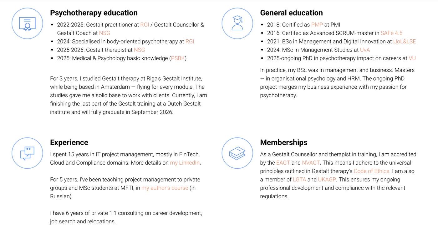 Я практикую гештальт с начала 2023 года. Недавно наконец получила основной диплом и сейчас на финишной прямой чтобы получить полную линцезию терапевта. В NL это очень долгий и сильно непрямой процесс.