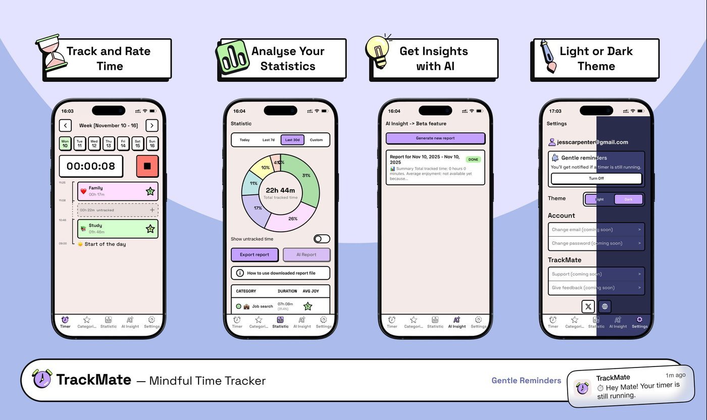 TrackMate — это PWA (Progressive Web Application) для мануального трекинга времени + анализ данных с помощью графиков и AI. Решили немного переобуться и перенести все на React Native, есть ощущение что PWA пока сложный для не технических пользователей.