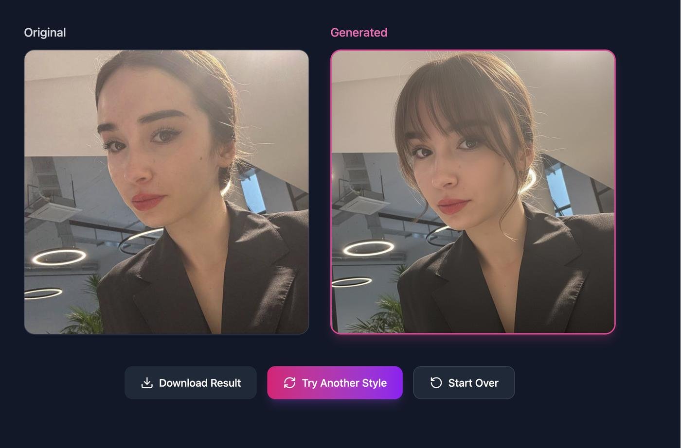 Остальные hair filter сервисы в интернете либо комично плохи, либо генерят фото долго + все равно с очень заметными артефактами. Сервис в разы лучше в качестве, он быстрее и намеренно прост