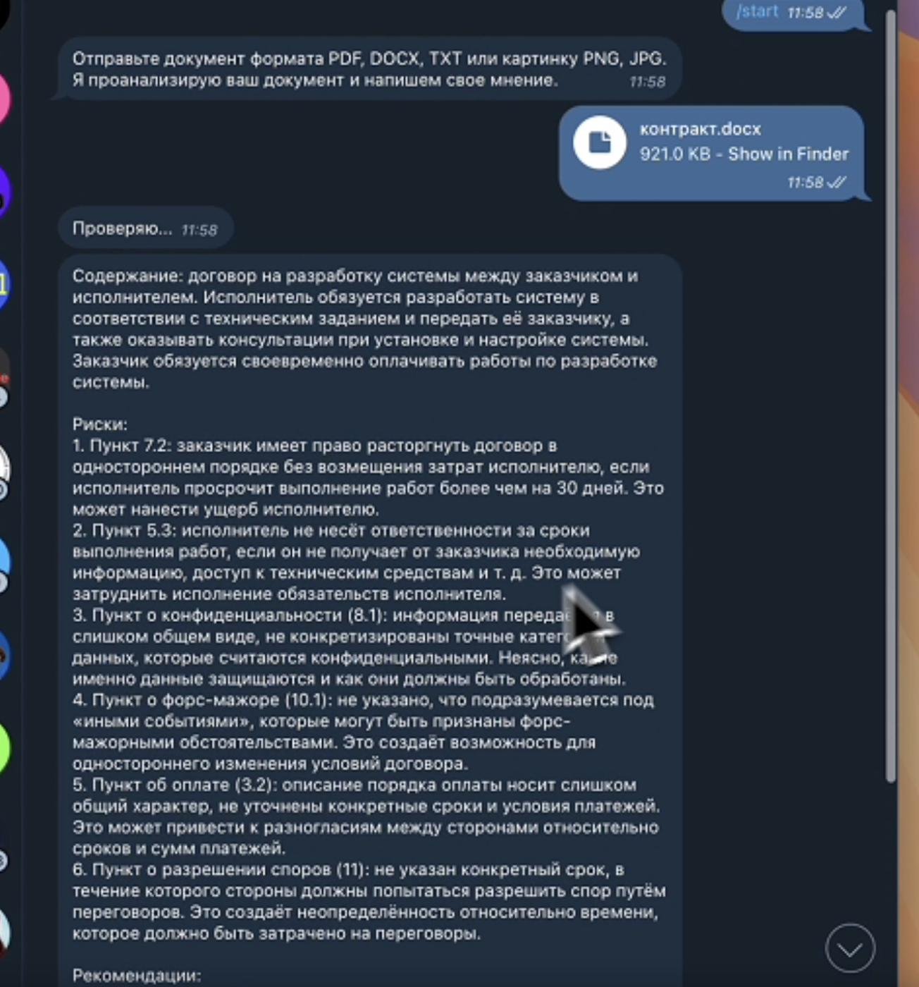 Бот для проверки договоров, работает просто, вы скидываете PDF, docx или фото договора, бот анализирует текст и подсвечивает опасные пункты.