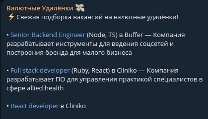 Тг-канал, в котором я собираю вакансии на валютные удалёнки для разрабов и не только. Сам постоянно ищу возможности, решил создать канал и делиться находками