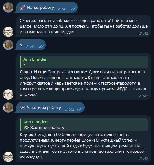 Бесплатный чат-бот, которого я разработала для себя и для других таких же трудоголиков, которые забывают поесть и попить, доводят плечи до окаменения, руки до туннельного синдрома, а вместо нормального окончания рабочего дня включают режим "ну сейчас еще одну задачку доделаю" и фигачат еще часа два.