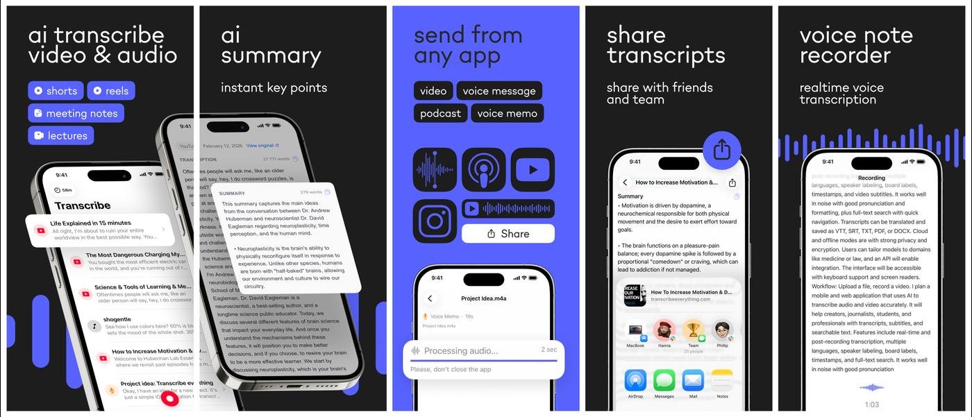 Работает с YouTube, Instagram, TikTok, Reels, голосовыми из whatsapp / telegram, файлами, видео из галереи. Есть live-транскрипция с микрофона.