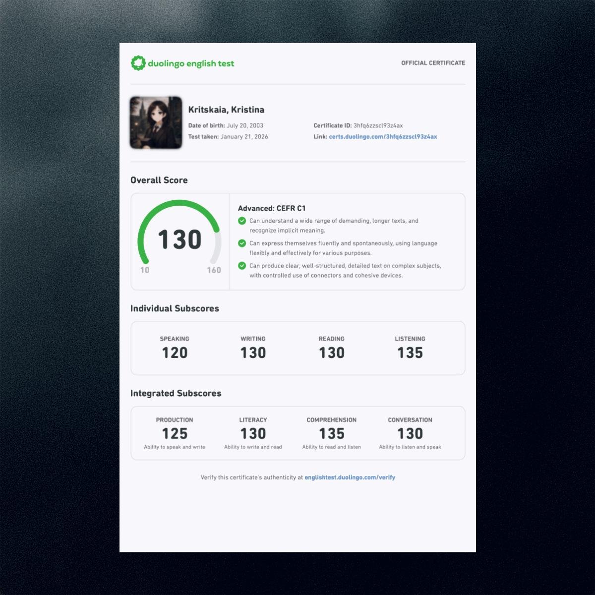 Итог — 130 баллов (уровень C1 подтверждён).