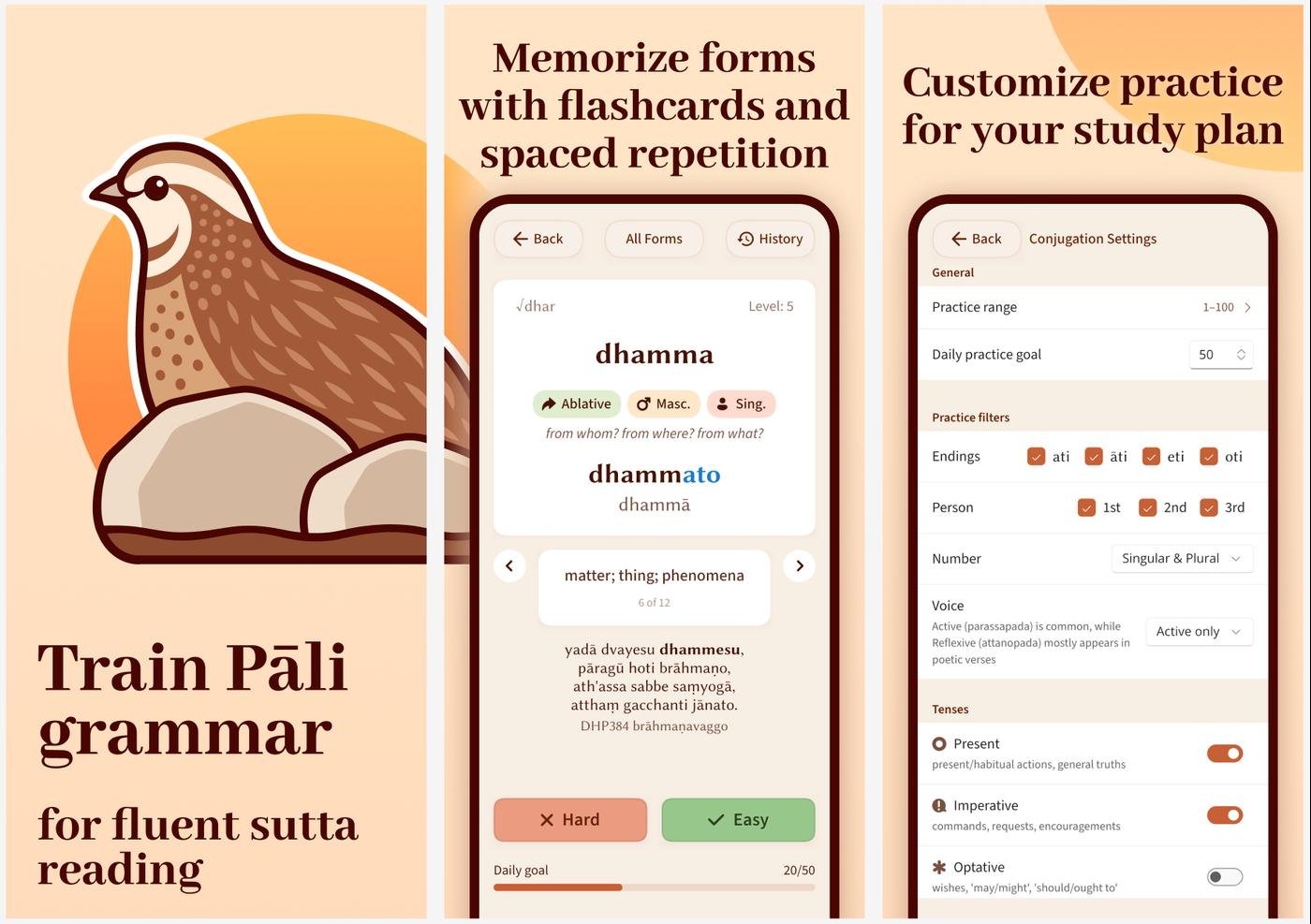 Бесплатное опенсорсное приложение для изучения грамматики языка пали (родственник санскрита, на нём записаны ранние буддийские тексты). По сути – флешкарточки с интервальным повторением, но UI заточен конкретно под нюансы падежей существительных и спряжений глаголов в пали.