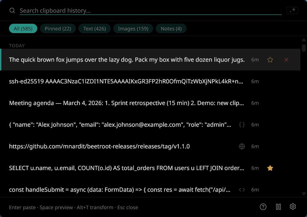 Beetroot — clipboard manager для Windows. Бесплатный, без аккаунта, без облака, без телеметрии. Всё хранится локально.