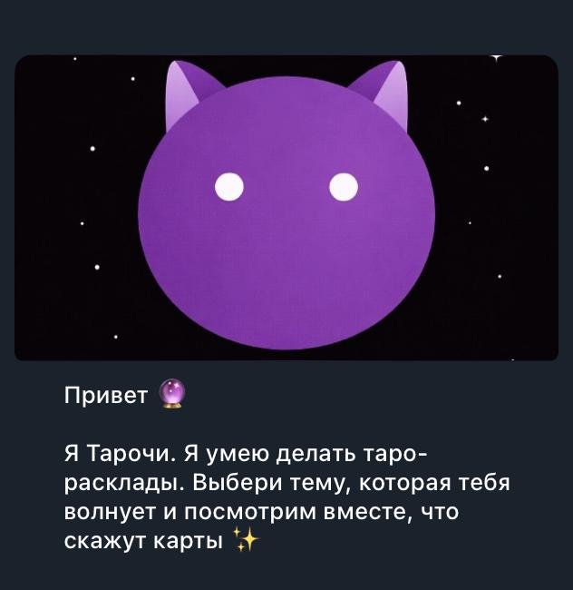 Идея простая - я люблю Таро как инструмент саморефлексии (это не про эзотерику, про неё я только шучу). Мы с женой постоянно переезжаем и колода с собой это лишний вес. Ботик супер простой, но результативный, проверьте сами, мне рассказывает и предсказывает всё супер точно)