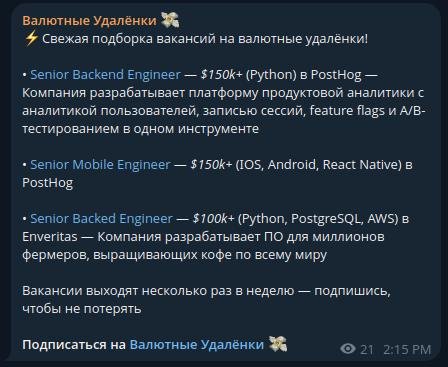 Тг-канал, в котором я собираю вакансии на валютные удалёнки для разрабов и не только. Сам постоянно ищу возможности, решил создать канал и делиться находками