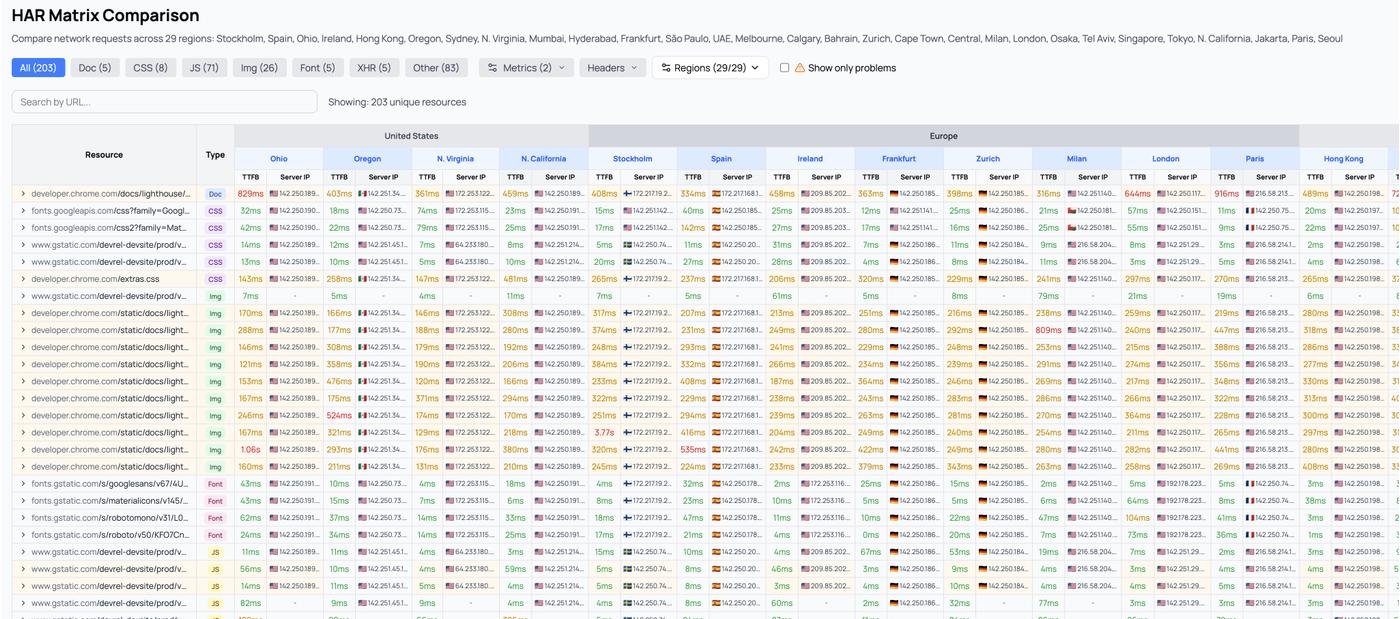 Отдельная киллер фича - это матрица HAR. Невероятно удобный инструмент, позволяет удобно сравнить как, загружается сайт в разных регионах.