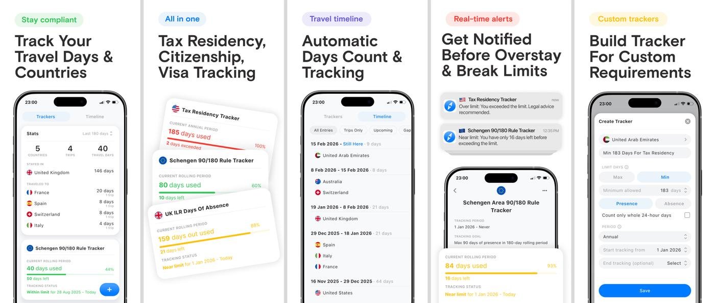 Это трекер дней пребывания или отсутствия в стране, с возможностью вести таймлайн своих поездок и создания собственных кастомных трекеров, для отслеживания различных правил (налоговых/визовых/иммиграционных/и тп.) для той или иной страны.